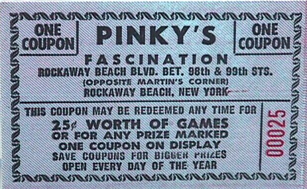 Yes, there was another Fascination in the Rockaways. Pinky's Fascination was located on Rockaway Beach Blvd. across the street from Playland. Below, a coupon worth merchandise and prizes or replays.