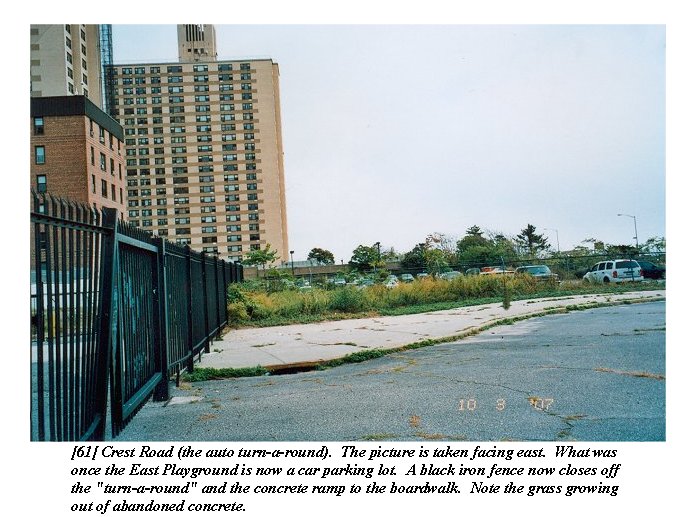 The concrete ramp going up to the boardwalk is still there but the little foot wash fountain is gone. Everything is overgrown and there was a lot of trash just lying about. The boardwalk itself is in splinters. In fact there was a link fence "roping off" a section where they appear to be replacing the wood and I got a picture of the work in progress. I took several photos facing all directions. The beach sand is still white--but the crabgrass and weeds appear to be reclaiming the beach. There are large pockets of "sand dunes" where the beach is reverting back to its natural condition. I looked for the rock jetty that had been in place for over 50 years, but I could not see it. The beach, always wide in this area, appeared to be even wider. Atlantic Beach, across the water, seemed to be very much closer than it had appeared to me when I was a child. The Good Humor Ice Cream "shack" which had been on the beach-side on about Beach 25th Street was long gone. The tubular metal railings appeared to be the same, and the wooden benches were all still in place--but in poor condition. I "shot" almost a whole roll of film in this area and if the weather had been better, I probably would have walked west on the boardwalk to that area on Beach 25th Street where that "first group" of concessions had stood--Jerry's Knishes, Jack & Lenny Klein's Skee-Ball, the hot dog shop and a small intimate bar.