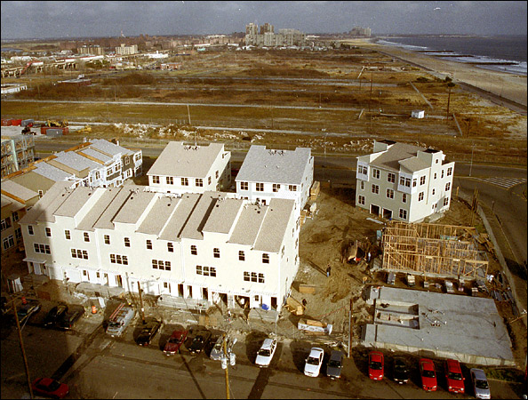 Using the two-family home as a sort of standard model (with one unit potentially providing rental income), builders have speckled the peninsula with hundreds of new houses over the last five years — three or four scattered among tattered though tenacious bungalows on this street or that; five square blocks lined with three-story town houses; acres blanketed by a hundred semiattached homes here, two dozen detached there, nearer to the surf.