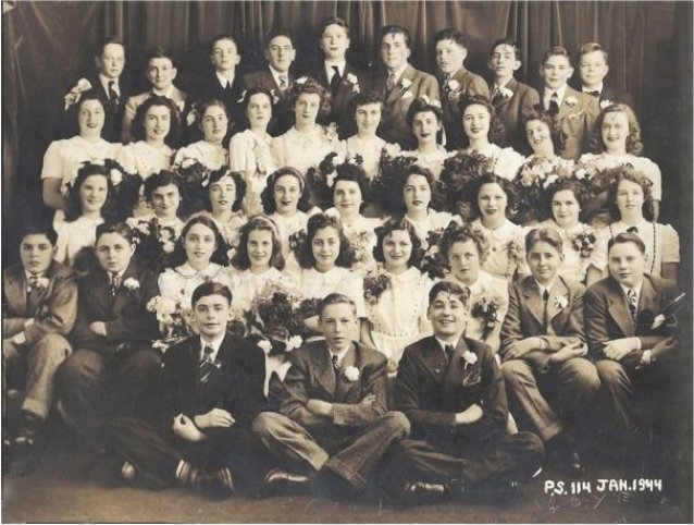 | P.S. 114 1944 8th Grade Graduation 2nd row from top: far right, Harriet Reiss; 4th from right, Doris Fenichel Coliins (the girl with the ribbon in her hair) Middle row: 4th from right, Rosalie Bornstein Klein; 4th from left Barbara King Shapiro |