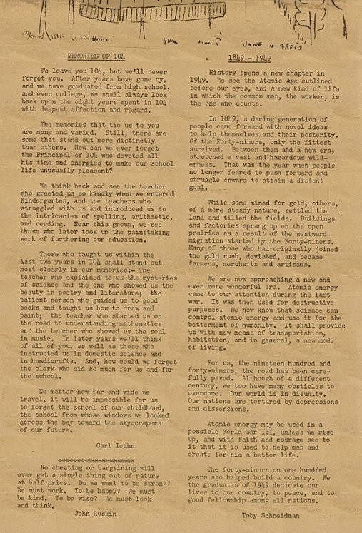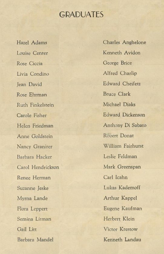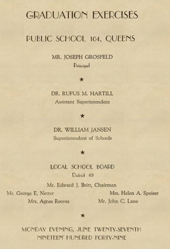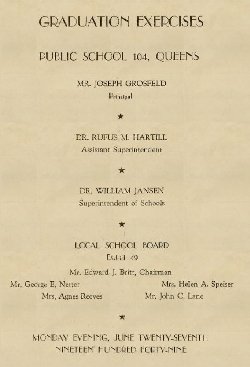 A Big THANK YOU to Rhonda for sending these wonderful memories. If you graduated from P.S. 104 in 1949 you should be able to find your name in the program.