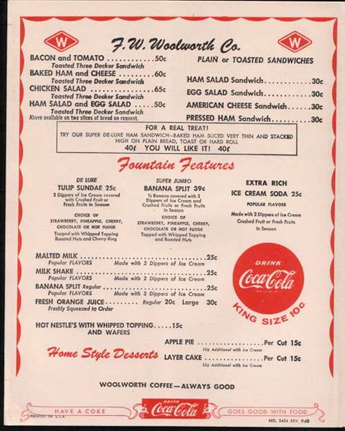Those of us who grew up in Far Rockaway in the 40's - 70's will certainly remember Grants and Woolworths on Central Avenue. In addition to the great values we could find for only 5 or 10 cents, Woolworth's had a lunch counter where you could sit down, take a break, and have ice cream or a sandwich. Thanks to Helene, you can take a walk down memory lane when the price of a Toasted Three Decker Baked Ham and Cheese sandwich was 60 cents, or a slice of apple pie and a coke was 25 cents. I'm not sure exactly what year this menu represents but you would have to say, those were the days!